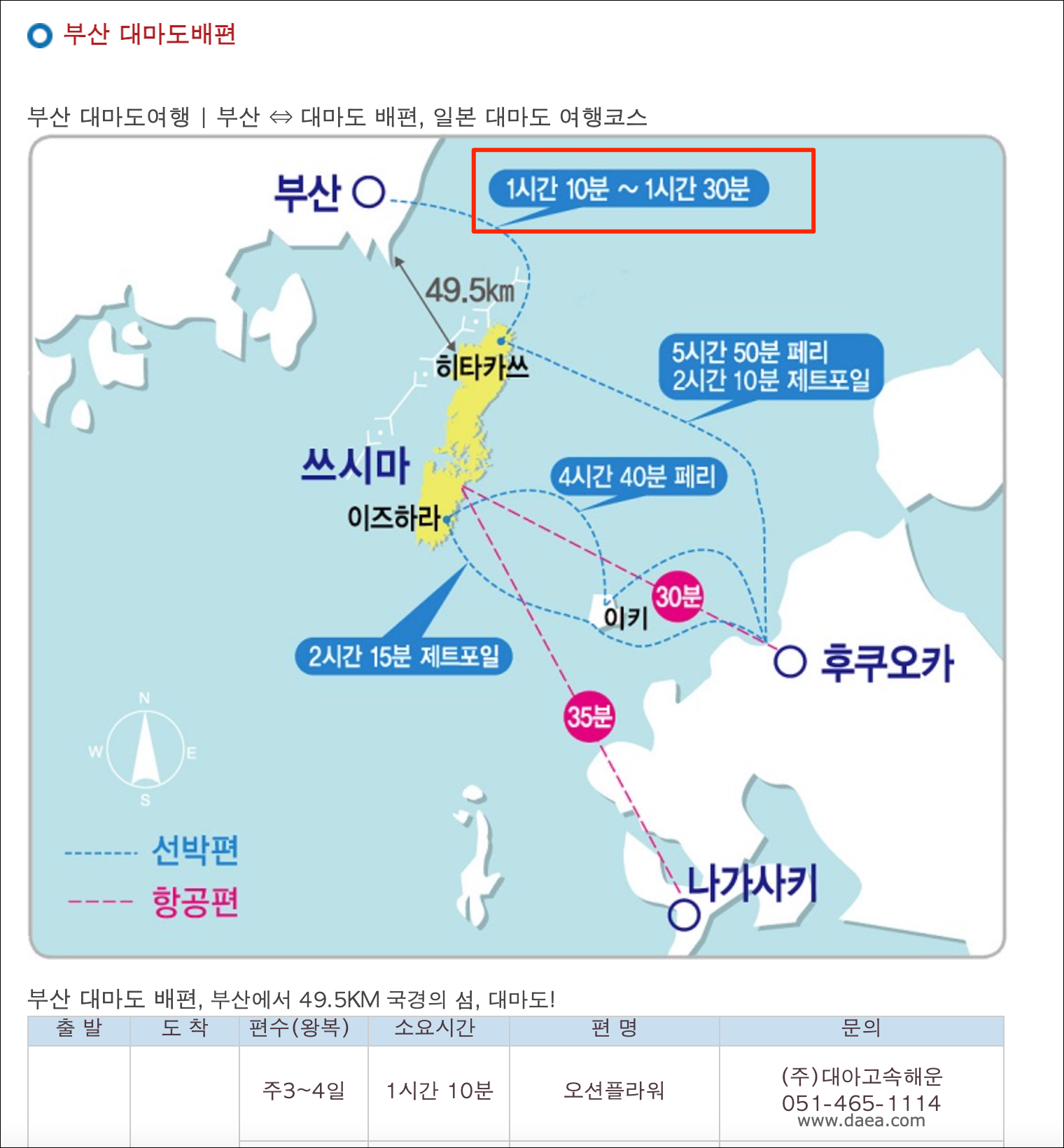 부산 - 대마도 배편은 대략 1시간 10분 ~ 1시간 30분 정도 소요된다고 합니다. 정말 가깝네요.