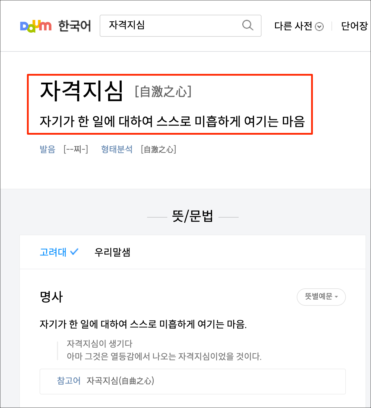 자격지심 이라는 표현을 자주 사용하는데, 정확한 사전 의미는 '자기가 한 일에 대하여 스스로 미흡하게 여기는 마음' 이었군요.