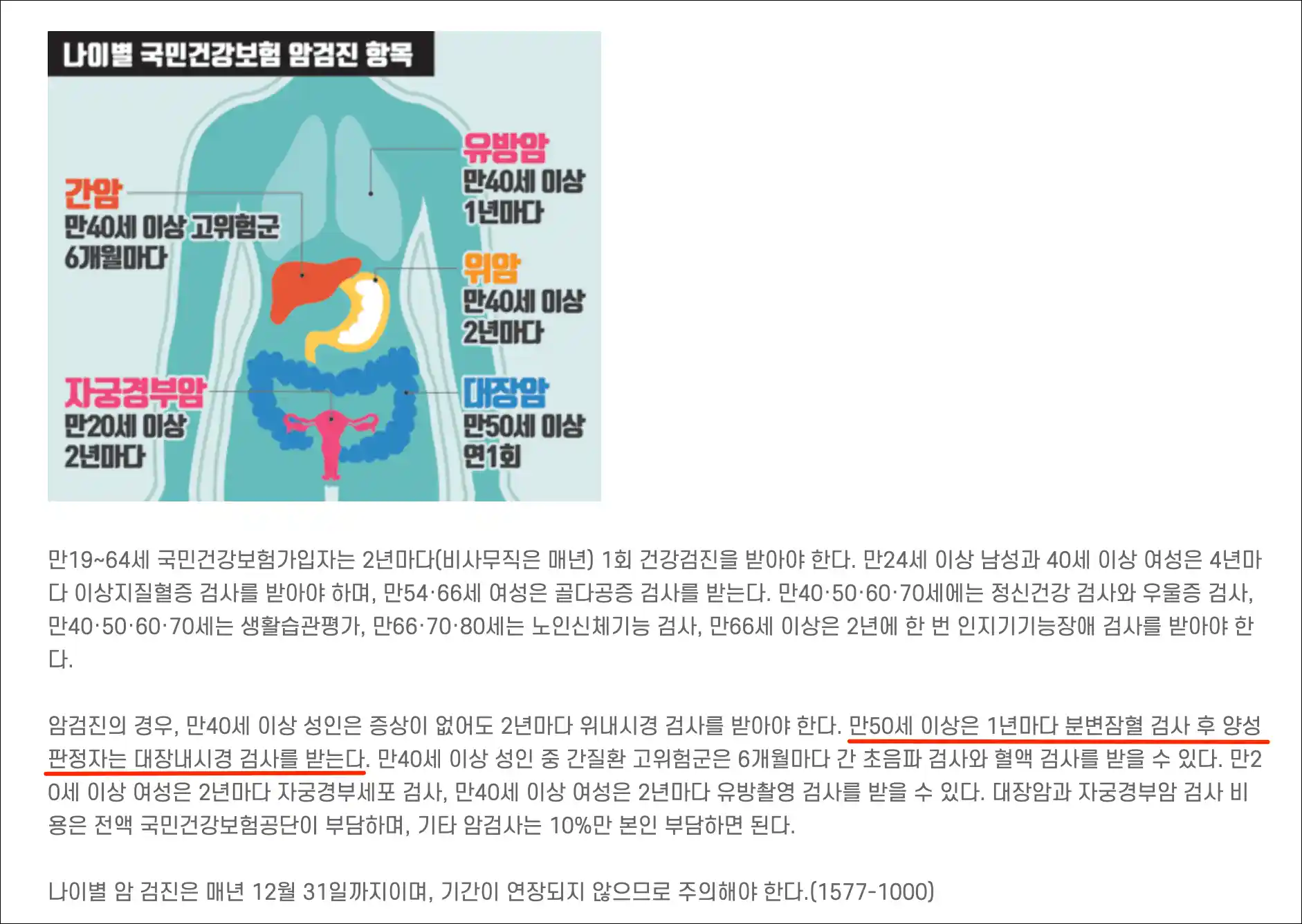 만19세-64세 국민건강보험가입자는 2년마다 건강검진을 받아야 합니다. 이중 대장내시경은 만 50세 이상에 해당되며 1년마다 분변잠혈 검사를 해서 양성으로 판정되면 받는다고 합니다.