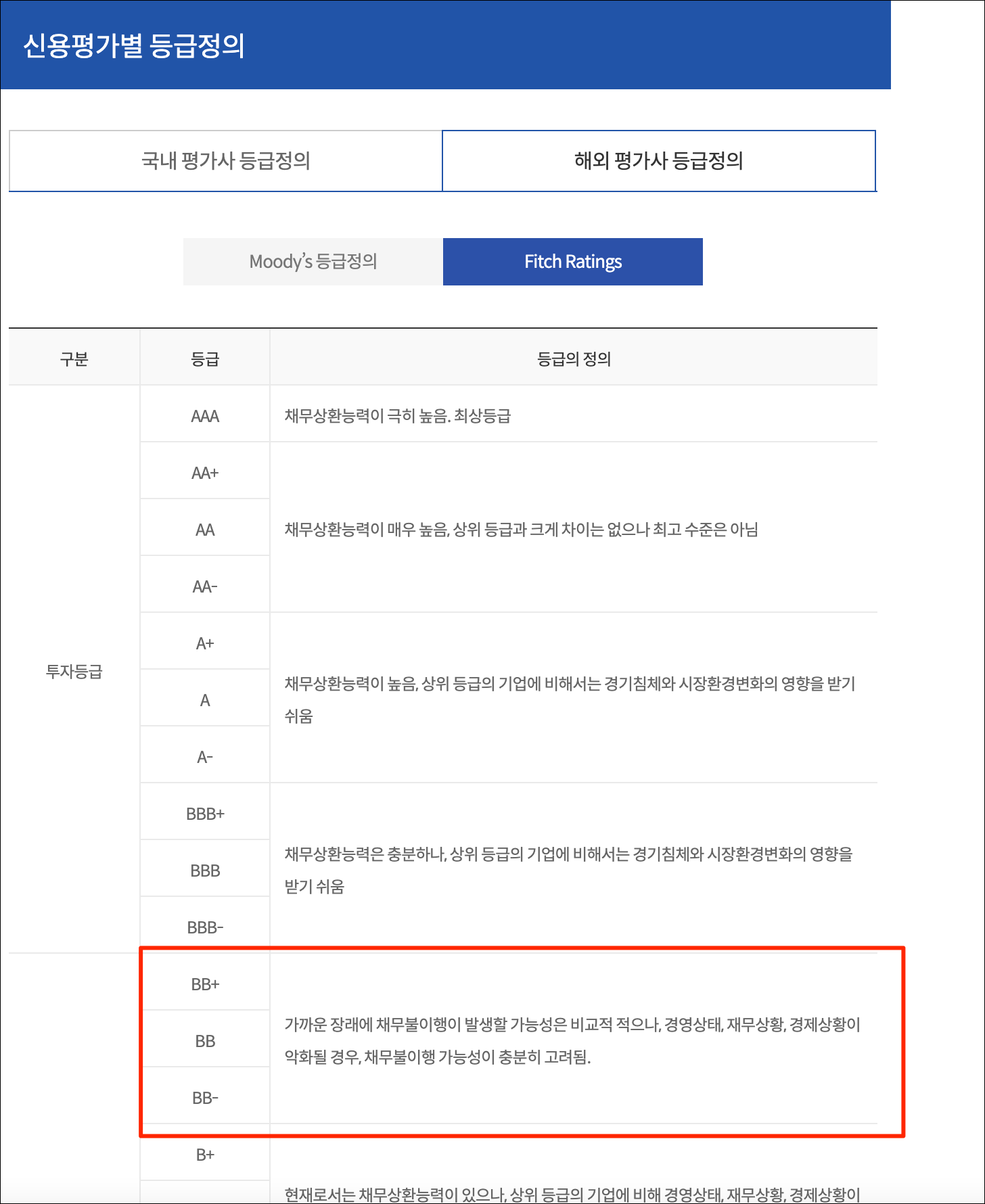 기업의 신용등급이 가끔 뉴스에서 나오는데, 각각의 의미가 세분화되어 있었네요. BB등급은 가까운 미래에 채무불이행이 될 가능성은 적지만, 경영상태가 계속 악화된다면 향후에는 채무불이행이 될 가능성이 충분한 상태네요.