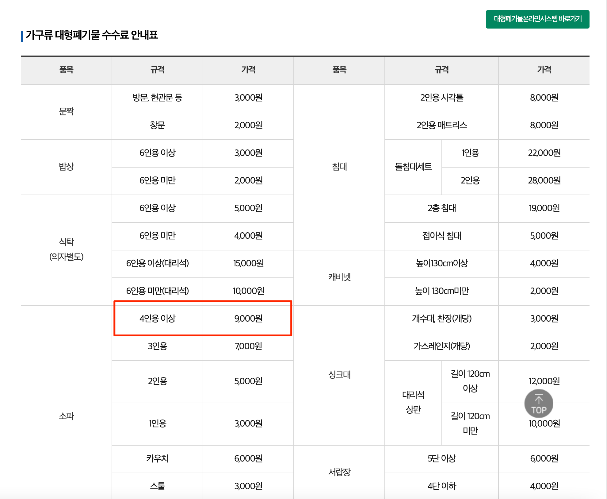 수원시 권선구의 대형폐기물 수수료 안내표를 참고하면 4인용 소파는 9,000원 이네요.