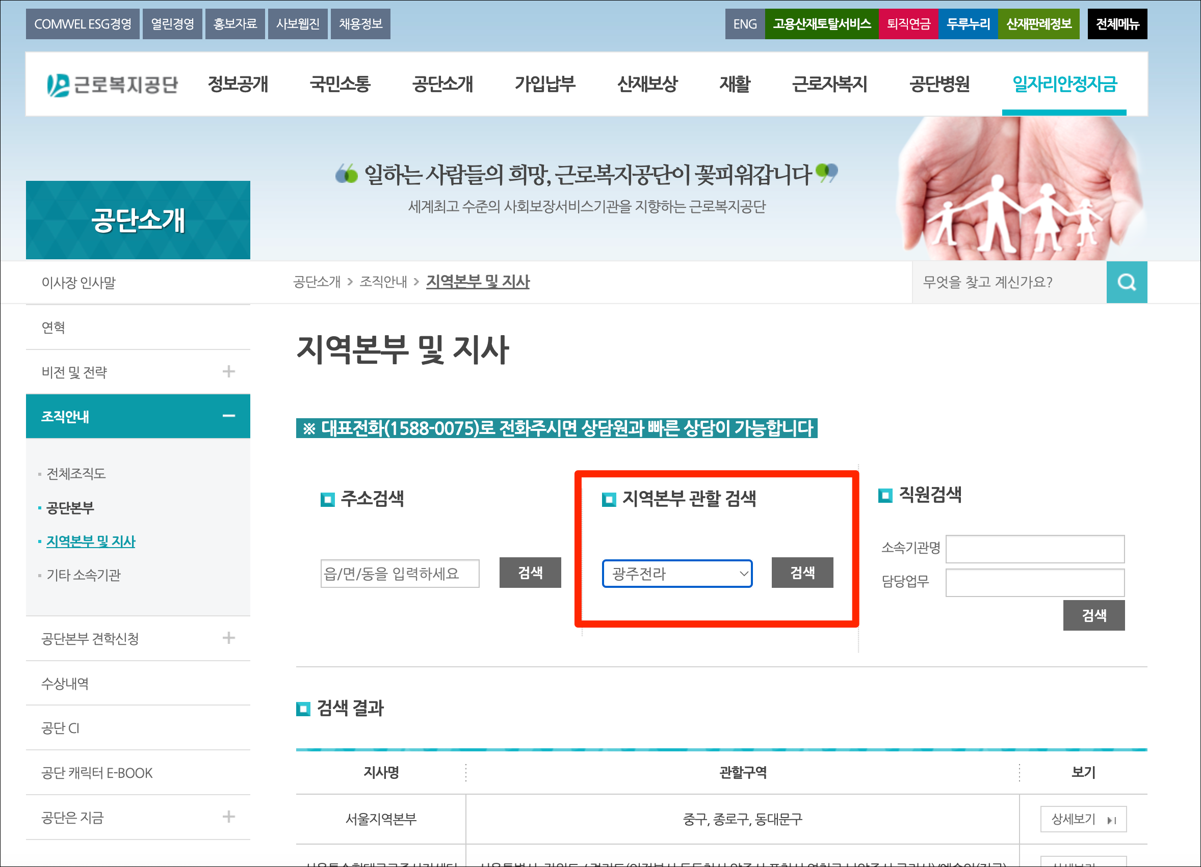 근로복지공단 홈페이지에 방문하셔서, 지역본부 관할검색란에 '광주전라'를 선택하고 검색을 합니다.