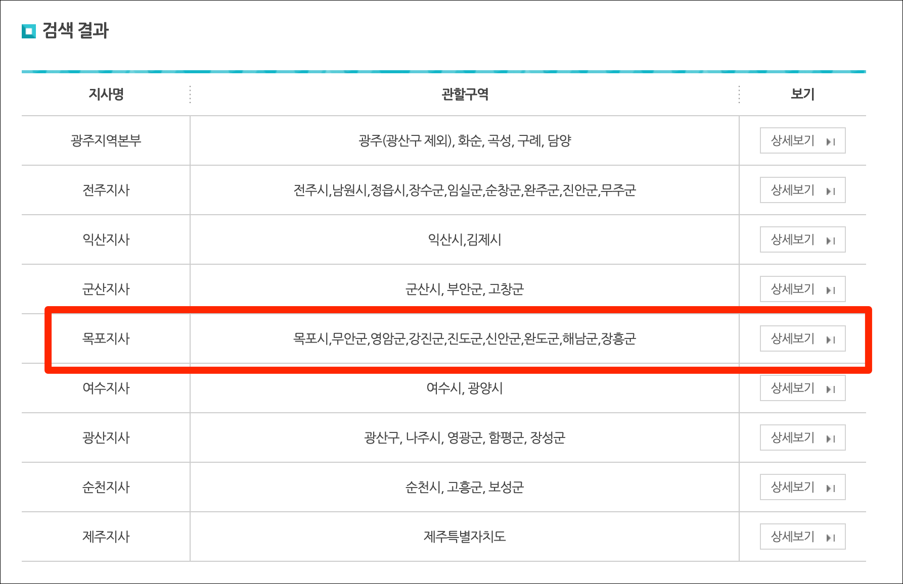 그러면 광주,전라 지역의 지사목록이 나오는데, 목포지사 옆의 '상세보기'를 클릭해보세요
