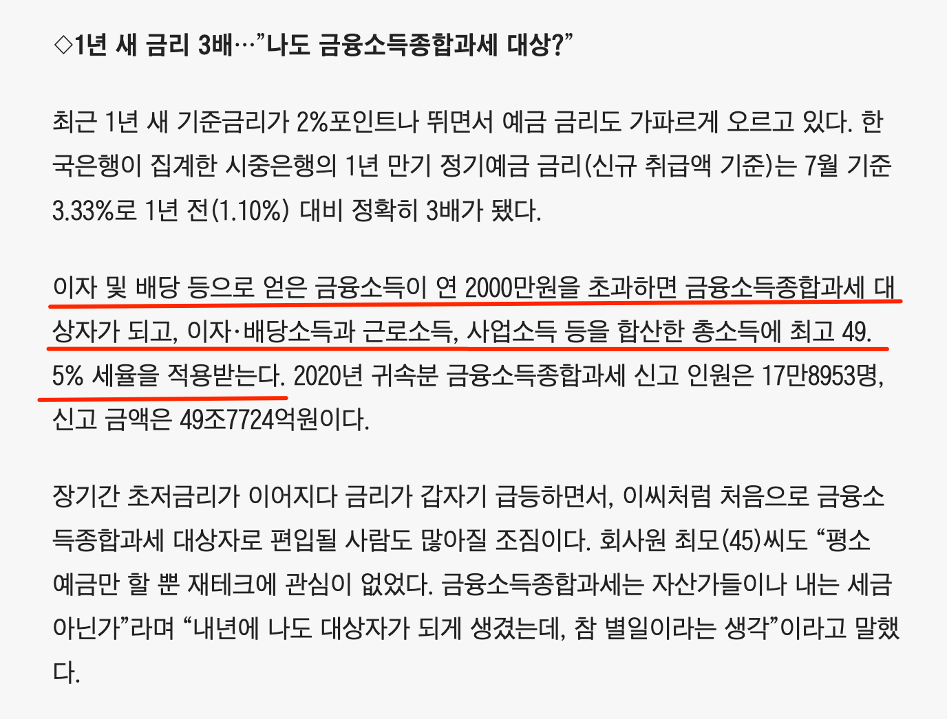 이자 및 배당으로 획득한 금융소득이 1년에 2000만원을 초과하면 금융종합과세 대상자가 되고, 세율이 엄청 올라가네요. 요즘에 은행 이자율이 올라가서 기존에는 대상이 아니었지만 새롭게 이 대상자가 되는 분들이 꽤 늘어날 것 같습니다.