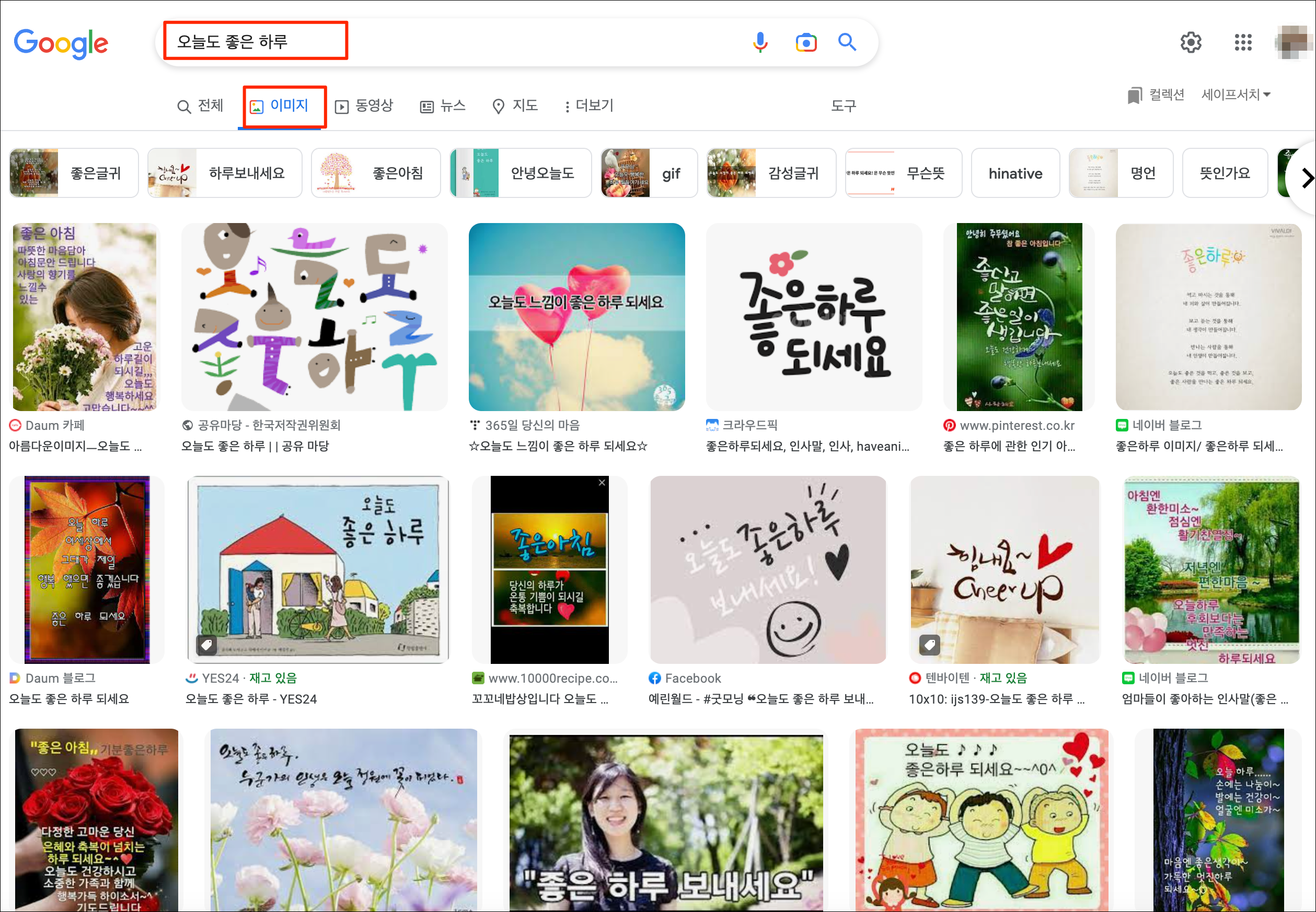 '오늘도 좋은하루' 라는 글귀를 담은 예쁜 이미지를 구할때는 구글 이미지검색을 활용해보세요. 예쁜 디자인의 인사용 이미지를 많이 발견할 수 있습니다.