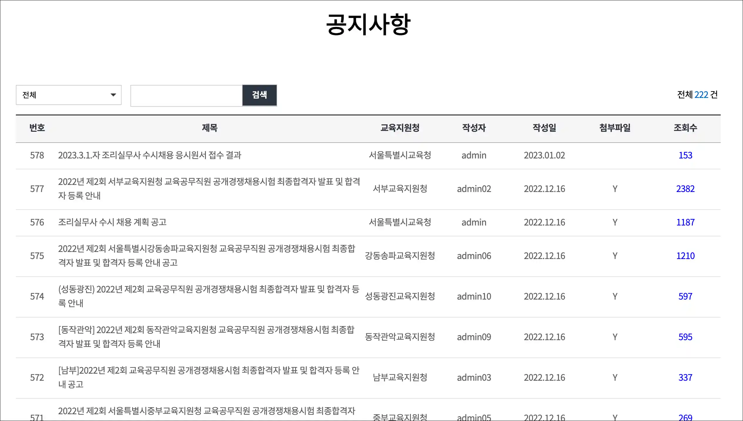 공지사항 공지사항 목록 : 번호,제목,교육지원청,작성자,작성일,첨부,조회수로 구성 번호 제목 교육지원청 작성자 작성일 첨부파일 조회수 578 2023.3.1.자 조리실무사 수시채용 응시원서 접수 결