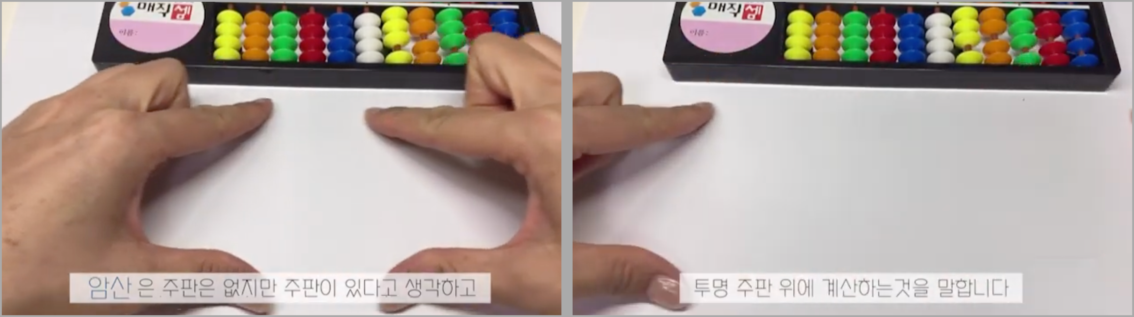그러니까, 상상속의 주판을 이용해서 계산을 하는게 주판으로 배우는 암산 방식이었네요. 독특합니다. 실제 주판이 없는데도 연습을 하면 주판이 그려지는가 봅니다. 이게 익숙해진다면 어디서나 암산을 쉽게 할 수는 있을 것 같아요.