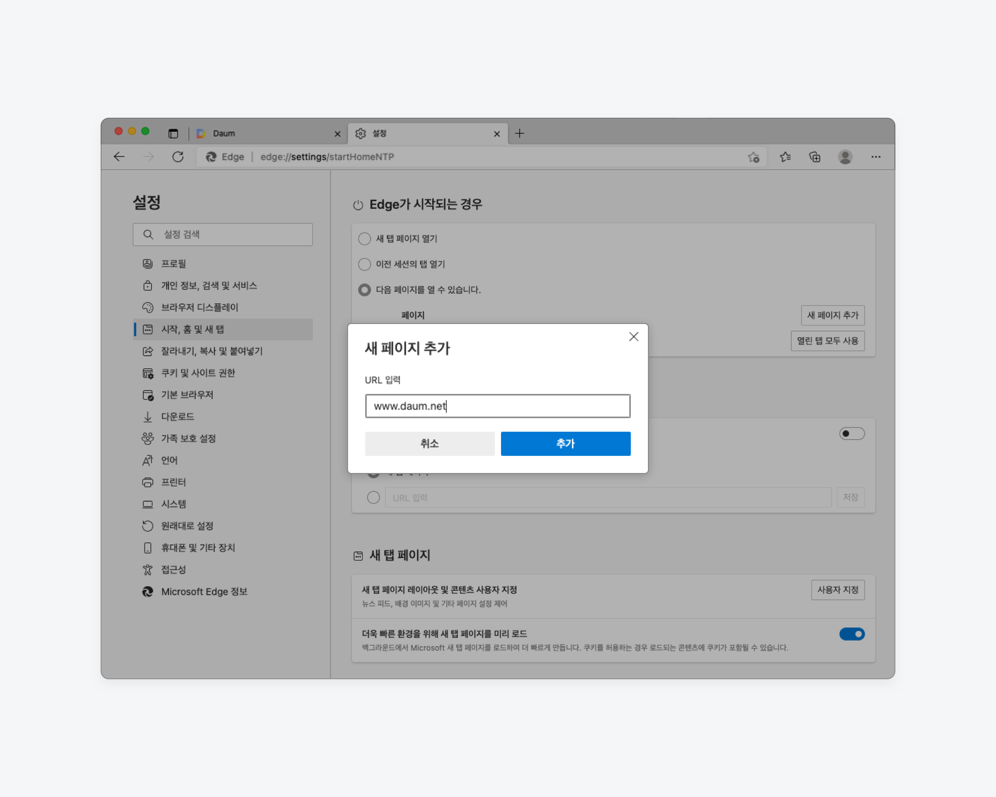 엣지 브라우저 환경에서 다음을 시작페이지로 설정하려면 어떻게 해야 하나요?