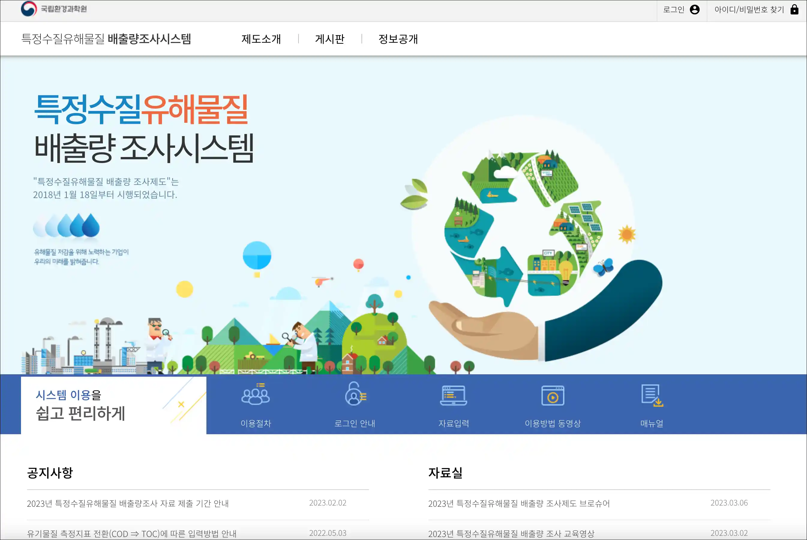 특정수질유해물질 배출량 조사시스템 "특정수질유해물질 배출량 조사제도"는 2018년 1월 18일부터 시행되었습니다.