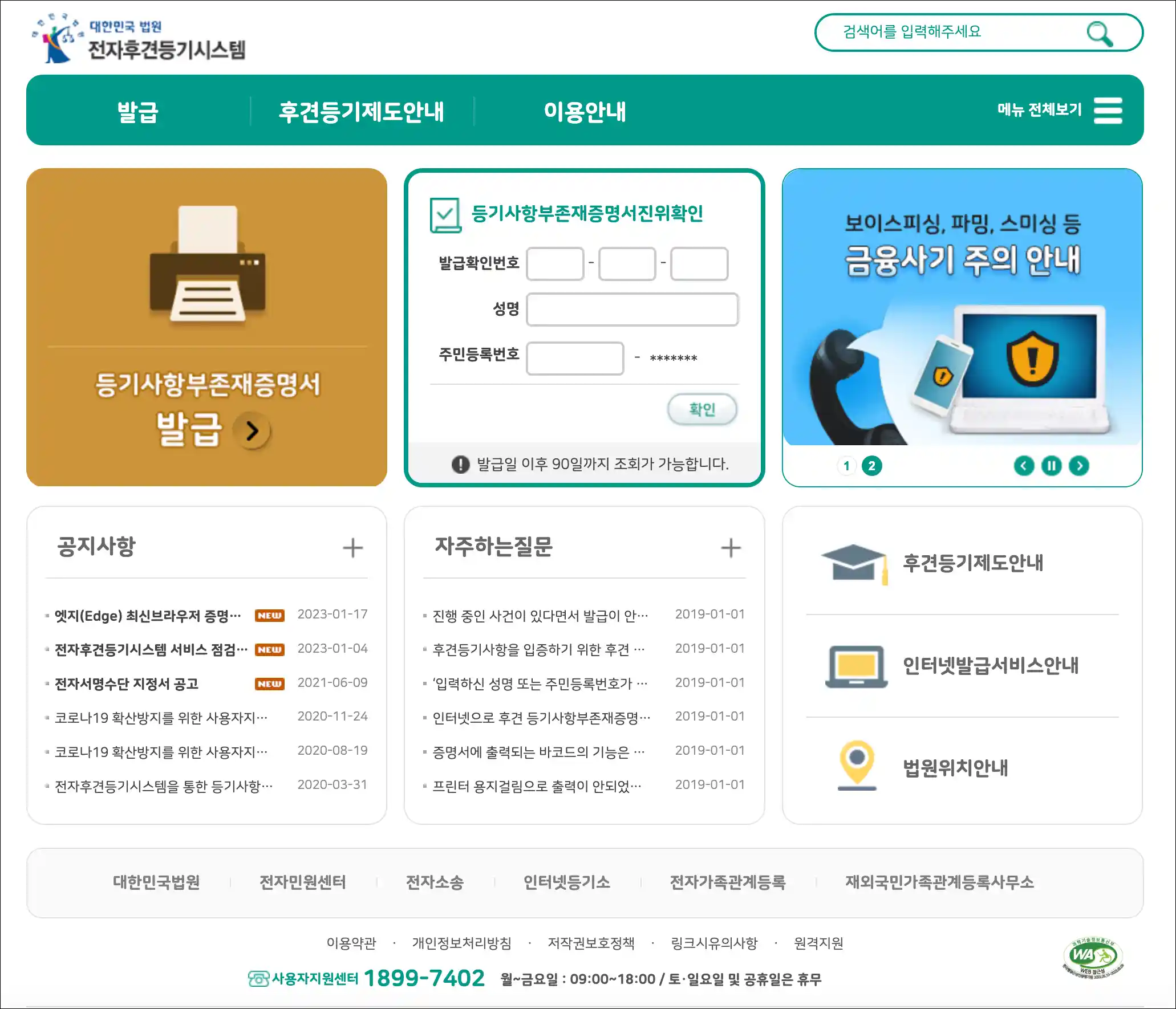후견 등기사항부존재증명서 발급, 재발급, 진위확인, 이용 안내 등.