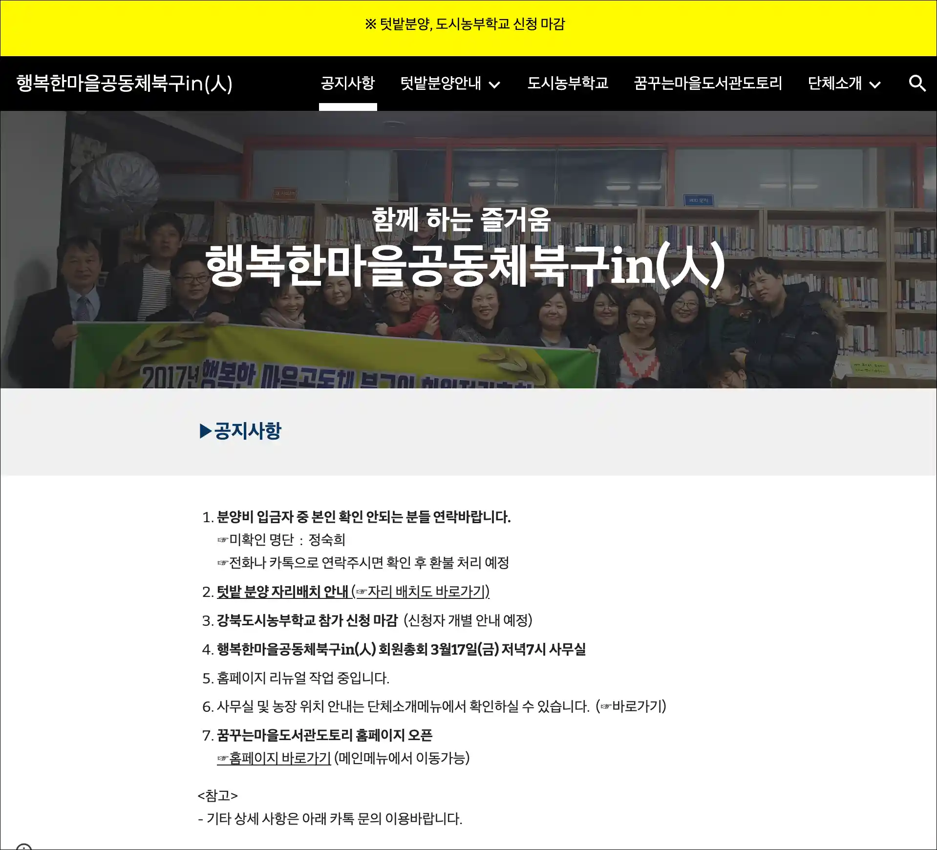 행복한마을공동체북구in(人)은 대구 북구 지역에서 주민자치와 생활문화 활성화를 위해 활동하는 비영리민간단체입니다. 꿈꾸는마을도서관도토리를 비롯하여 다양한 주민 동아리 사업을 운영하고 있습니다. 또한, (부설)도시농업센터 그린나래를 통해 도시농업 활성화를 추진하고 도시의 생태적 생활을 만들기 위해 노력하고 있습니다.