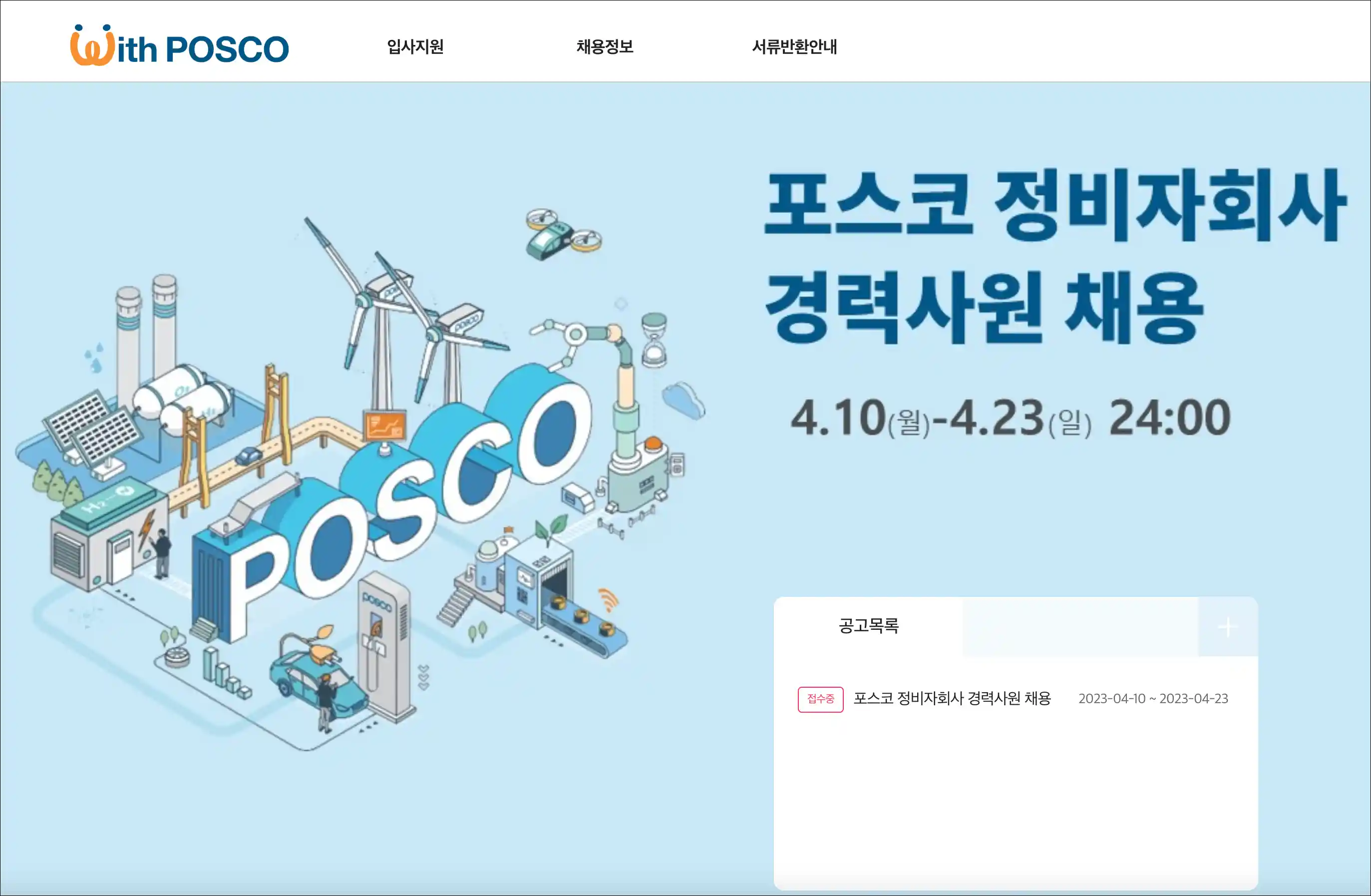 4월 10일부터 23일까지 포스코 정비회사 경력사원 채용 중입니다.
