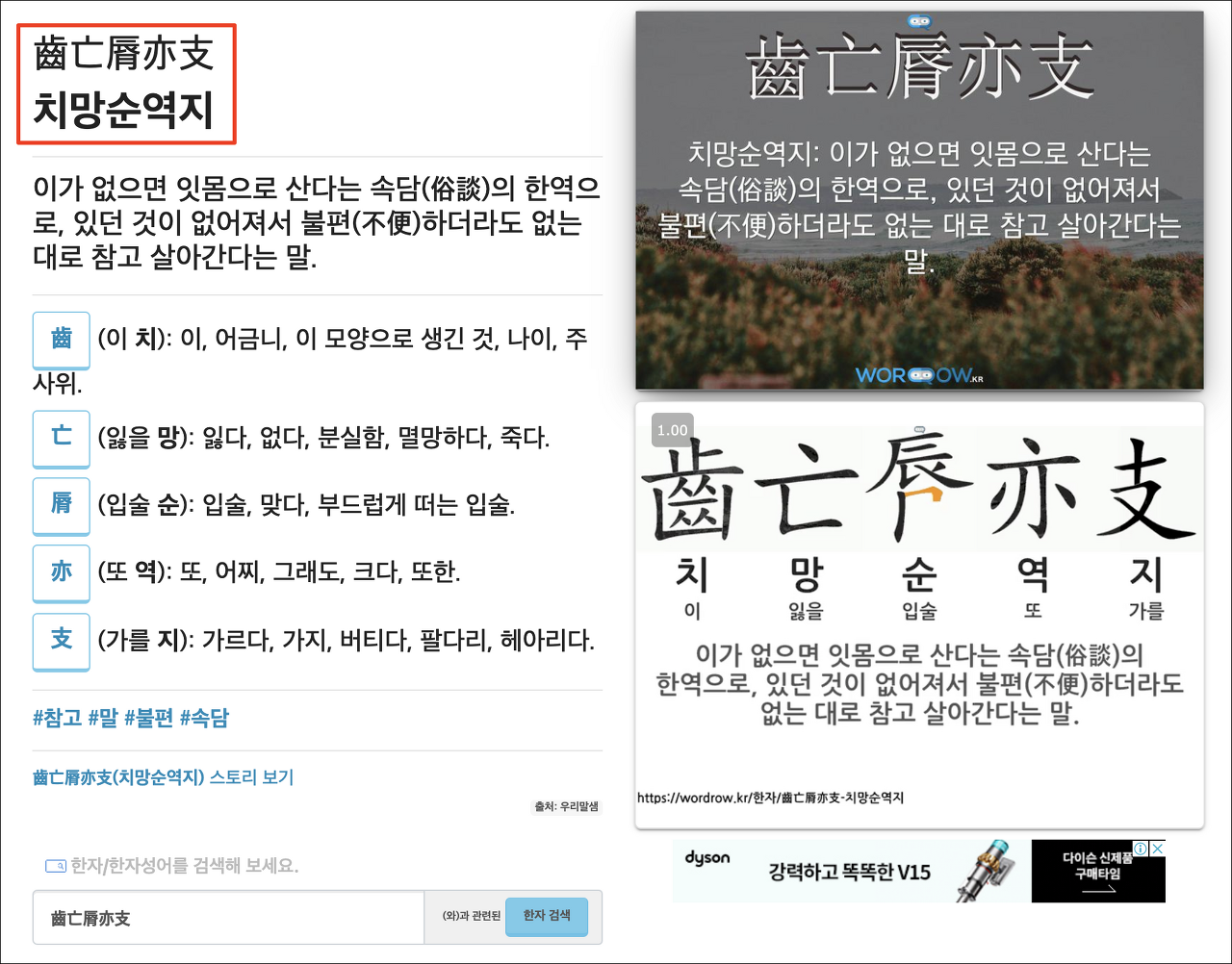 齒亡脣亦支 (치망순역지)의 의미: 이가 없으면 잇몸으로 산다는 속담(俗談)의 한역으로, 있던 것이 없어져서 불편(不便)하더라도 없는 대로 참고 살아간다는 말.