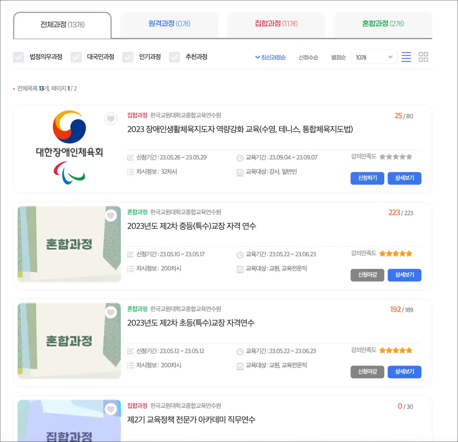 유용한 사이트 소개 한국교원대학교종합교육연수원 (https://tot.knue.ac.kr) 곰돌이푸아빠 2023. 5. 29. 08:01 https://tot.knue.ac.kr/ 한국교원대학교종합교육연수원 tot.knue.ac.kr 전체 운영중인 과정은 아래 페이지에서 확인 가능합니다. https://tot.knue.ac.kr/lh/ms/ac/atnlcAplyListView.do?menuId=3000001020 한국교원대학교종합교육연수원 전체목록 13개, 페이지 1 / 2 tot.knue.ac.kr 공유하기 게시글 관리 푸른하늘아래 짙은구름 저작자표시 (새창열림) The greatest glory in living lies not in never falling, but in rising every time we fall. – Nelson Mandela '유용한 사이트 소개' Related Articles 인천교육청 4세대 지능형 나이스업무포털 주소 안내 (https://ice.eduptl.kr) KT 채널 편성표 (tv.kt.com) 구리포천고속도로 (www.gpeway.com) PQM (pqmgmp.co.kr)