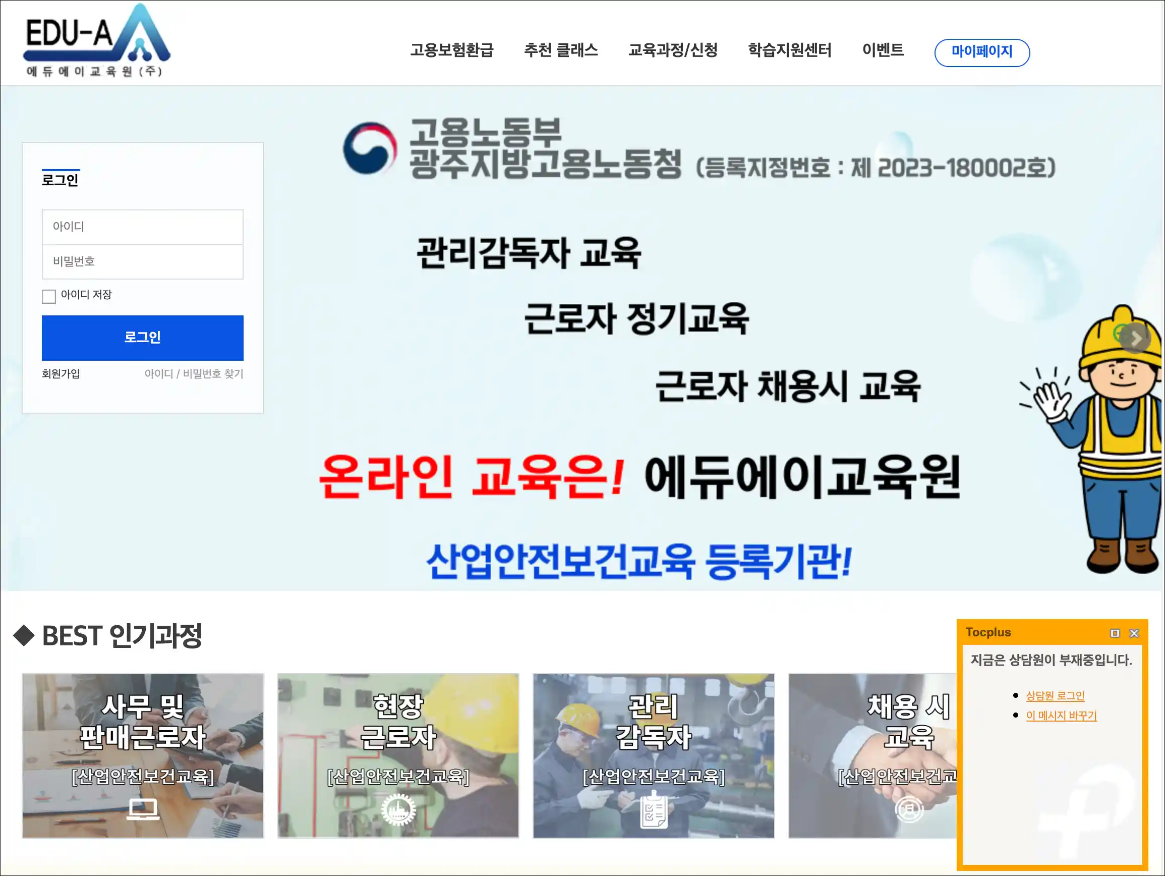 유용한 사이트 소개 에듀에이직업능력개발훈련원 (www.edua.kr) 곰돌이푸아빠 2023. 10. 28. 17:59 https://www.edua.kr/ 에듀에이직업능력개발훈련원 고용노동부지정원격교육훈련원 / 지사-전북미래교육원, 전남미래교육원 www.edua.kr 공유하기 게시글 관리 푸른하늘아래 짙은구름 저작자표시 (새창열림) The greatest glory in living lies not in never falling, but in rising every time we fall. – Nelson Mandela '유용한 사이트 소개' Related Articles 한국장례문화진흥원 온라인 교육 (estudy.kfcpi.or.kr) 충청북도교육청 사이버연수원 (cbe.kehrd.com) 임실엔양념마을사업단 (www.imsiln.kr) 2023년 상장법인 사외이사 등을 위한 자본시장 관련 주요 이슈 설명회 (https://kosdaqca.kwebinar.kr)