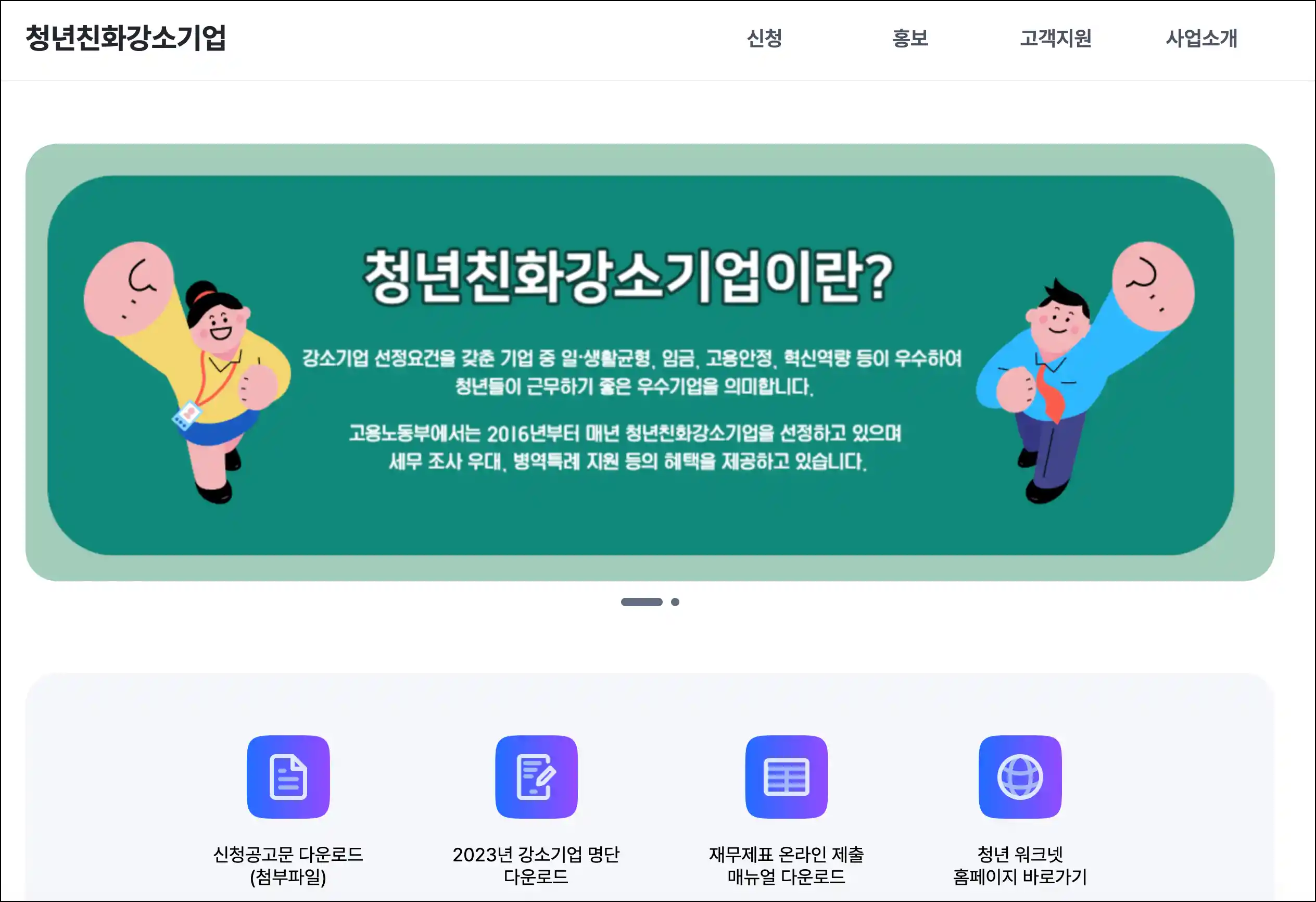 주요 기능으로는 청년친화강소기업에 대한 신청 및 접수 확인, 신청 방법 및 선정 기준 안내, 그리고 청년친화강소기업으로 선정되기 위한 다양한 조건과 혜택 정보 제공 등이 있습니다. 대상 사용자는 청년층을 대상으로 하는 일자리 창출에 기여하고자 하는 중소·중견 기업 및 관련된 청년 구직자들입니다.