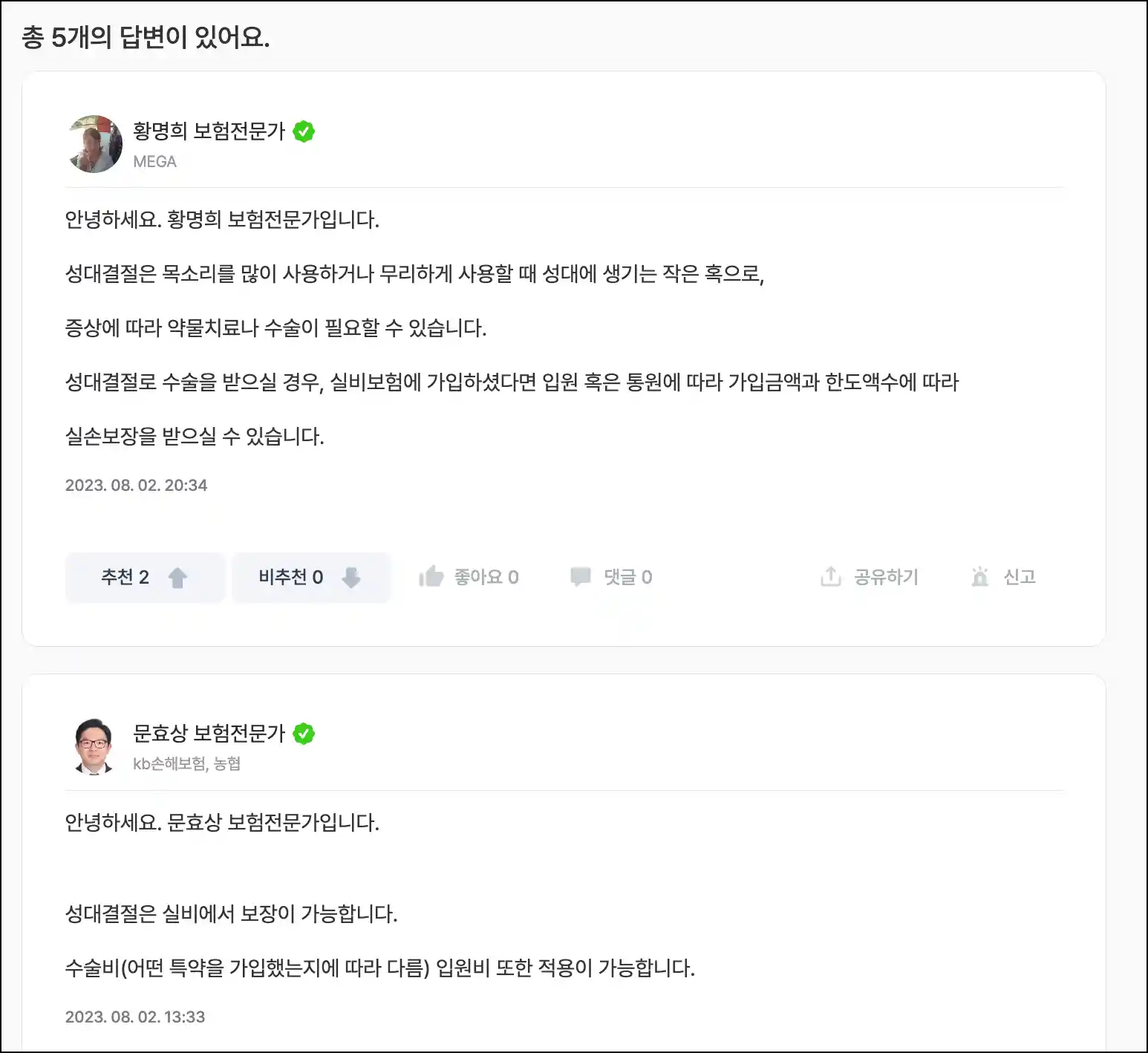 이 페이지는 성대 결절 수술 시 보험 적용 가능성에 대한 질문과 전문가 답변을 제공하는 토론 포럼입니다. 여러 보험 전문가들은 성대 결절 수술이 실비보험에 의해 입원비와 통원 치료비로 보장될 수 있으며, 수술비 보장은 특약 가입 여부에 따라 다를 수 있다고 답변했습니다. 수술 후 음성 회복에 대한 예방 및 조언도 제공됩니다.