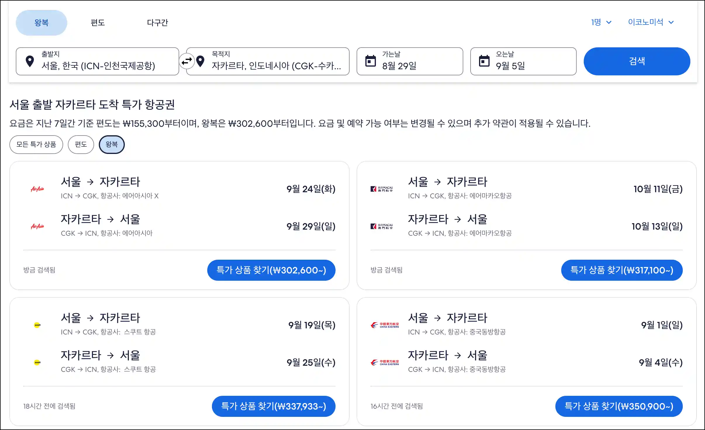 서울(ICN) -> 자카르타(CGK) 특가 항공권 ₩155,300~ | 익스피디아-항공권 예약