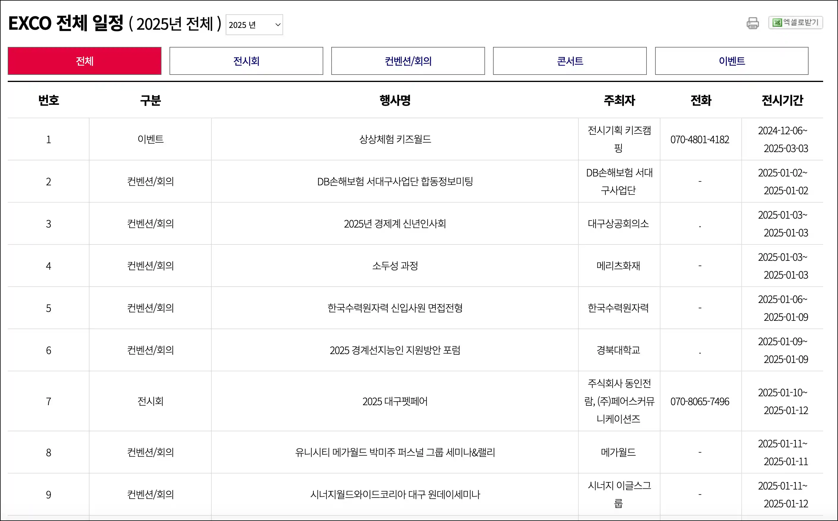 EXCO(엑스코)의 연간 행사 일정을 제공합니다. 전시회, 컨벤션, 콘서트 등 다양한 이벤트와 세부 일정, 주최자 정보가 포함되어 있으며, 연도별로 정리된 행사를 확인할 수 있습니다. 주요 대상은 전시회 및 컨퍼런스 참가자, 기업, 일반 방문객입니다.
