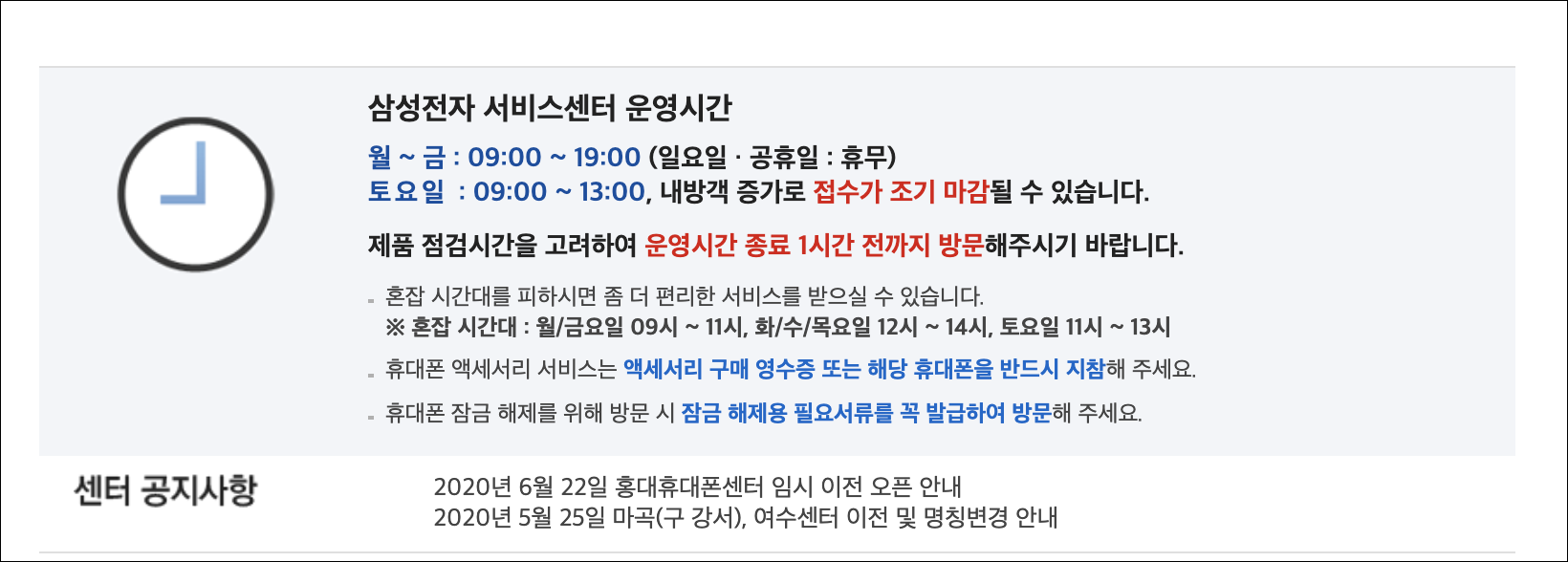 삼성전자 as센터는 월~금은 9시 - 19시 근무를 하고, 토요일에는 9시 - 13시까지 입니다. 만약에 내방객이 많으면 접수가 조기 마감될수도 있다고 합니다. 참고하세요.