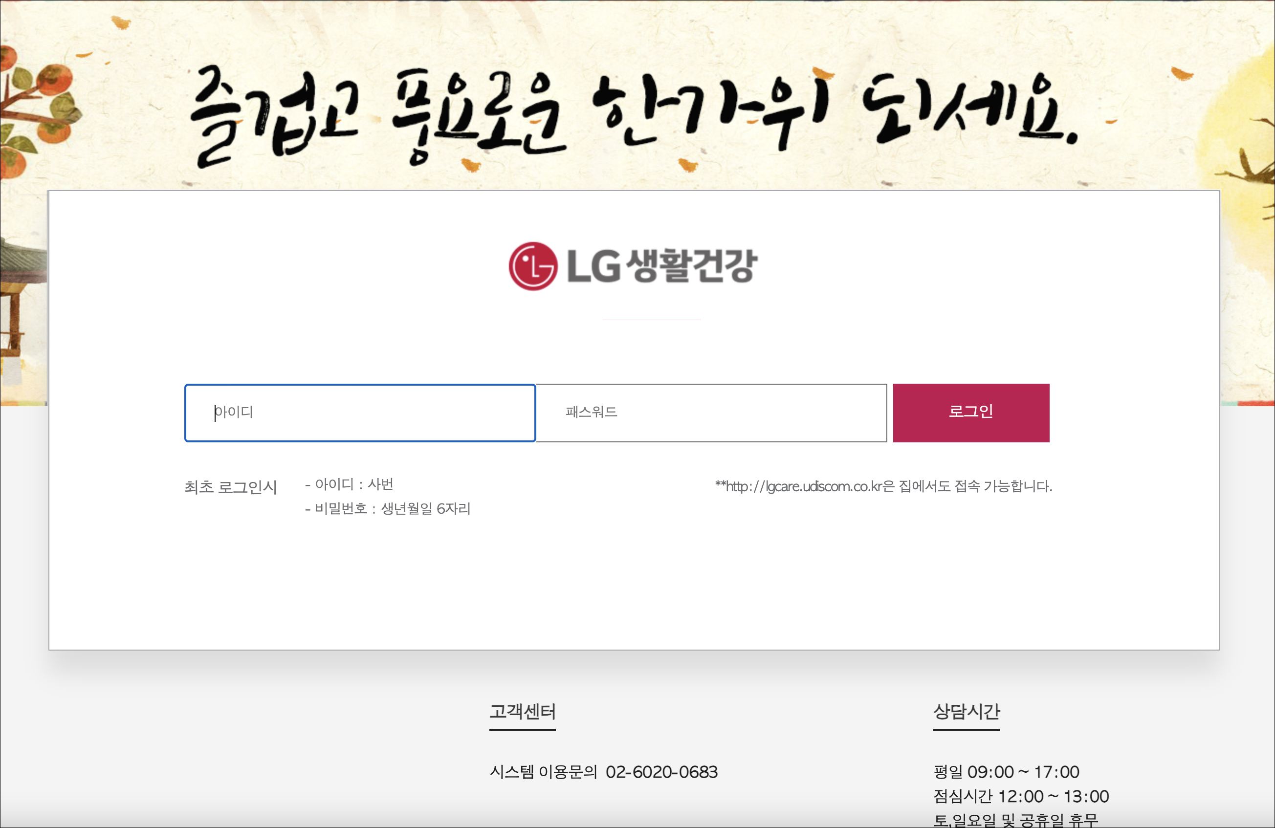 유용한 사이트 소개 LG생활건강 명절몰 (http://lgcare.udiscom.co.kr) 곰돌이푸아빠 2021. 7. 27. 06:43 LG생활건강 명절몰 lgcare.udiscom.co.kr 공유하기 게시글 관리 푸른하늘아래 짙은구름 저작자표시 (새창열림) The greatest glory in living lies not in never falling, but in rising every time we fall. – Nelson Mandela '유용한 사이트 소개' Related Articles 국민건강보험 전용휴양소 예약서비스 (https://gsa.plusn.co.kr/nhis/login.html) 스토리파크「知中慧」(http://www.storypark.or.kr) 한국학원총연합회 서예교육협의회 (http://www.kaaca.co.kr) 전북은행 선불카드 사용등록 (http://m.site.naver.com/0OcYQ)
