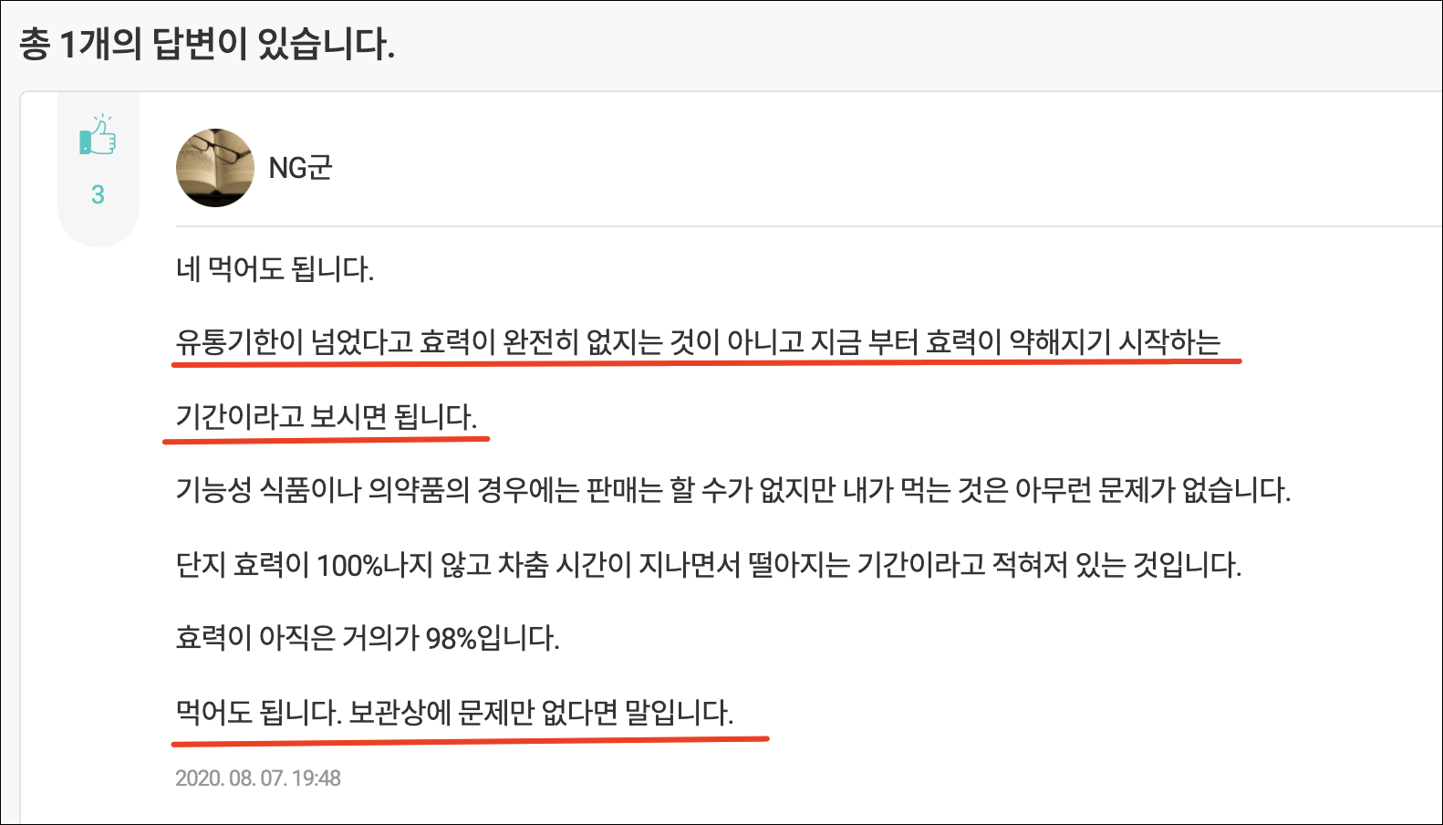 유통기한이 지났어도 보관상태에 문제만 없다면 먹는데는 이슈가 없다고 하네요. 아주 오래 지난건 안되겠지만, 조금 지난건 효력이 다소 떨어질뿐 괜찮다고 합니다. 하루 이틀 정도 지난건 먹도록 해야겠어요.