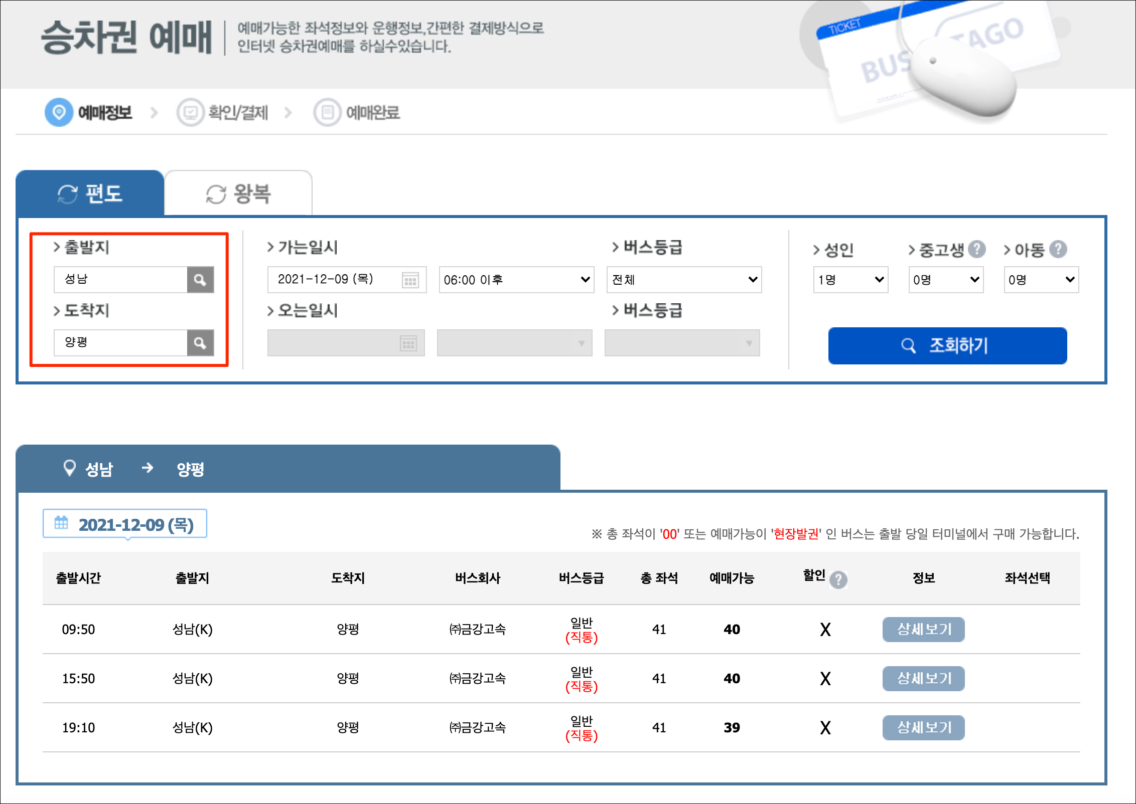 궁금궁금 성남에서 양평가는 버스 시간표는? 곰돌이푸아빠 2021. 12. 9. 06:58 승차권 예매 > 예매정보 중고생: 20% 할인 - 만 13세 이상 ~ 만 19세 미만 - 중고생 할인 시 학생증(청소년증) 필수 지참 (일부 터미널 제외) ※ 상기 운임은 대중교통 청소년 요금관련 권고 사항을 기준으로 적용되었으며, www.bustago.or.kr 성남에서 양평으로 가는 버스 시간표를 확인해보세요. 공유하기 게시글 관리 푸른하늘아래 짙은구름 저작자표시 (새창열림) The greatest glory in living lies not in never falling, but in rising every time we fall. – Nelson Mandela '궁금궁금' Related Articles 간호조무사가 한의원에서 하는일은 어떤건가요? 돌아가신 아버지가 화를 내는꿈 꿈해몽은? 강자한테 강하고 약자한테 약한를 한자로 표현하면? 귀뚜라미보일러 에러코드 34는 어떤 내용인가요?
